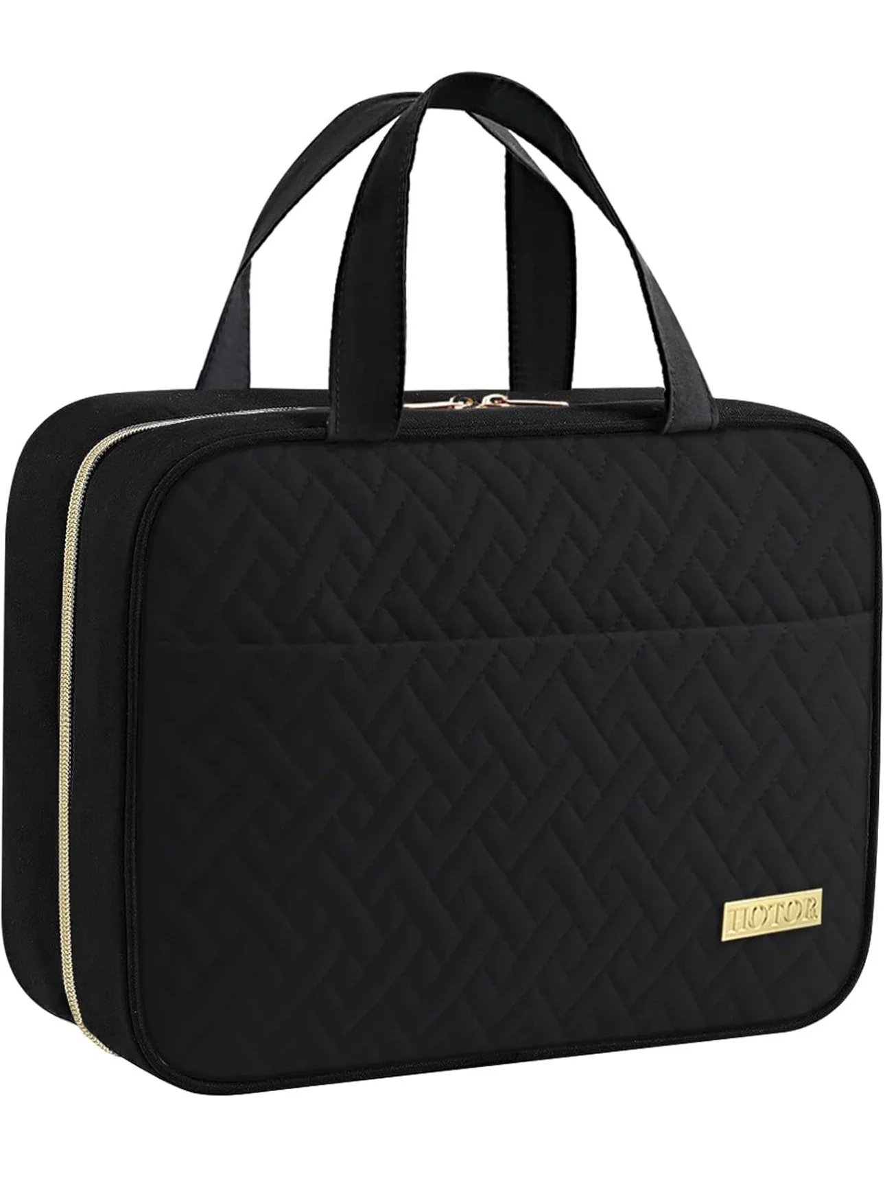 Black quilted rectangular tote bag with dual handles and a gold logo plate on the front.