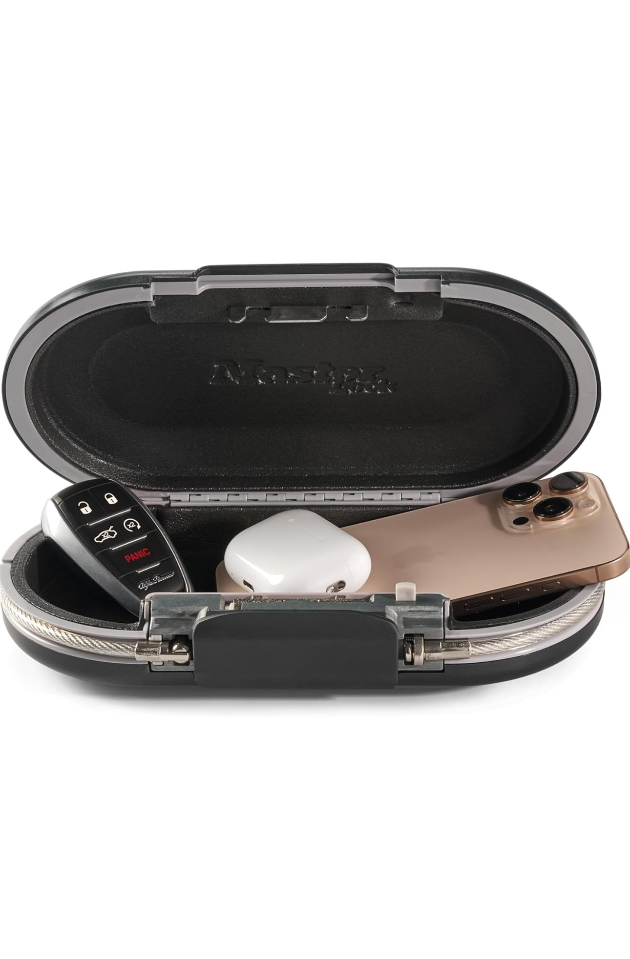 Open black hard case containing a key fob, wireless earbuds, and a smartphone.
